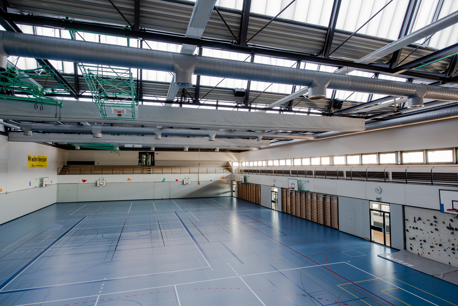 Unsere grosszügige 3-fach-Sporthalle und der Kraftraum bieten Platz für Sportevents, Trainings oder Fitnesskurse. Perfekt für sportliche Herausforderungen auf höchstem Niveau.
